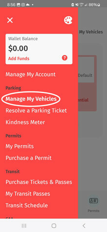 - Click the menu, then 'Manage My Vehicles' then 'Add Vehicle'